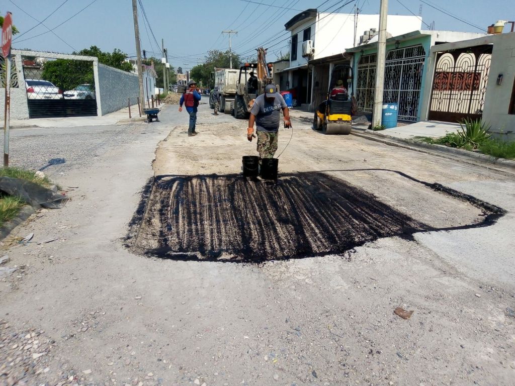 La colonia Fuentes Sección Lomas es objeto del trabajo del Alcalde Carlos Peña Ortiz, quien instruyó a la Coordinación General de Servicios Públicos Primarios a rehabilitar las calles Río Pesquería y Río Tuxpan, donde se utilizan 40 toneladas de asfalto caliente.