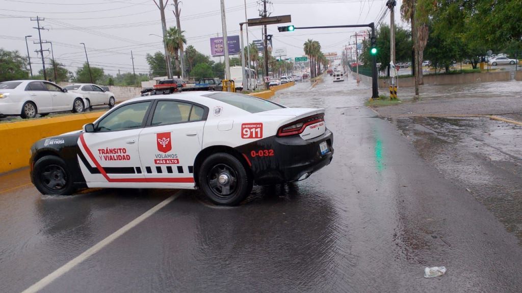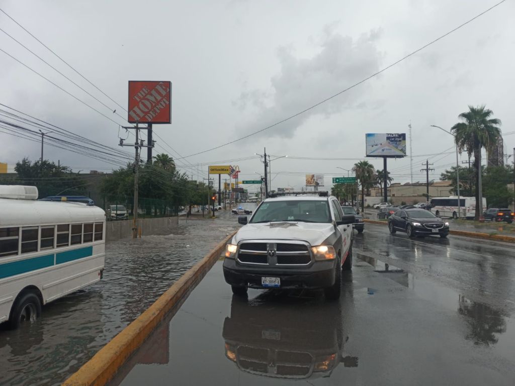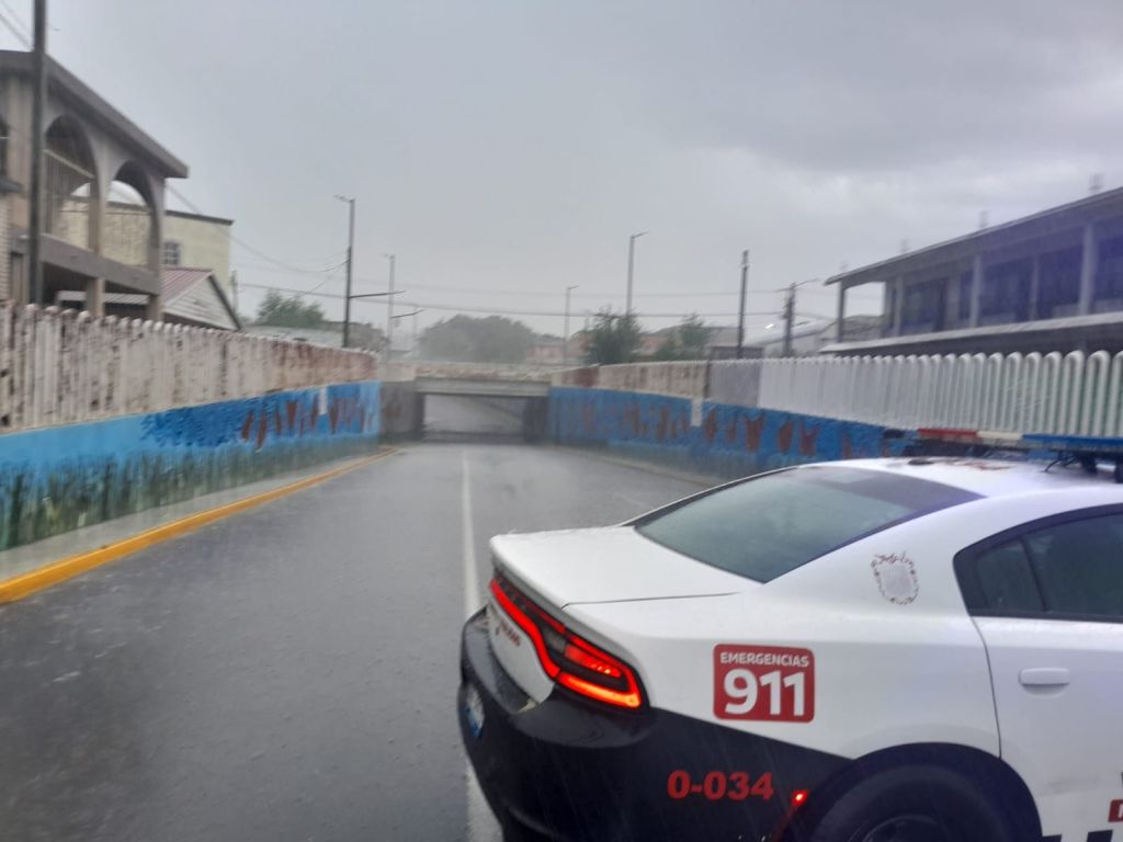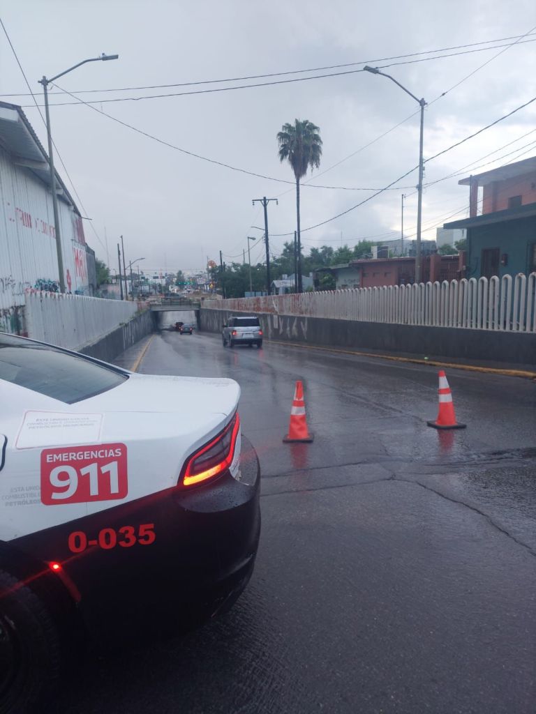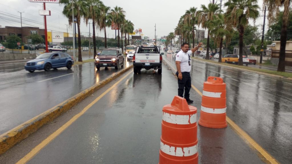 Elementos de Tránsito cerraron de manera preventiva, por acumulación de agua, los Puentes a Desnivel 1 y 2, y el cruce del carril lateral del bulevar Hidalgo con Fuente de Diana, para ser liberados conforme se desagüen.
