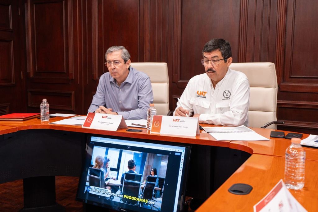 En una sesión virtual, el rector de la UAT, MVZ Dámaso Anaya Alvarado, acompañado por el secretario de Finanzas, Mtro. Eduardo García Fuentes, recibió la presentación del programa por parte de directivos del organismo empresarial.