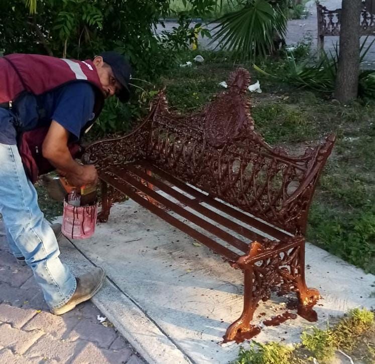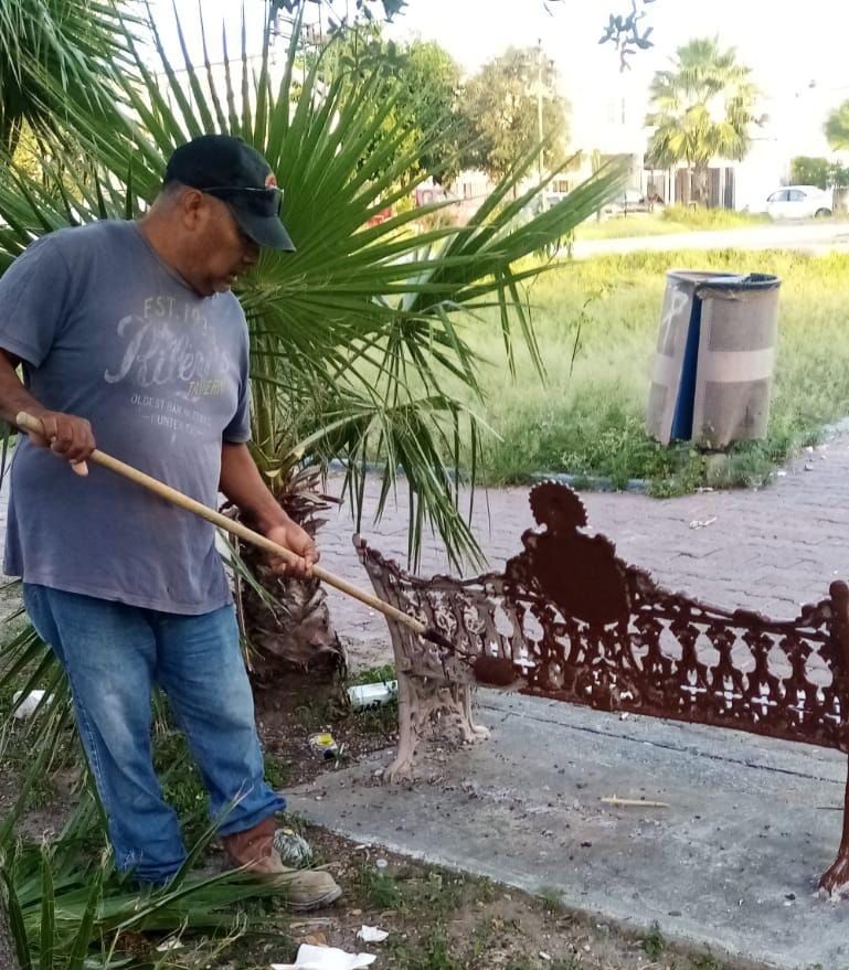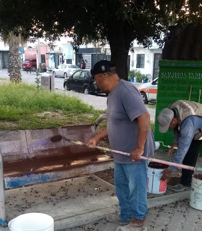 Esta mañana cuadrillas del Ayuntamiento reparan la malla ciclónica de la plaza pública de la colonia El Olmo, y en Lomas Real de Jarachina Norte efectúan reparación y pintura de juegos infantiles para embellecerlos y que ofrezcan mayor seguridad.