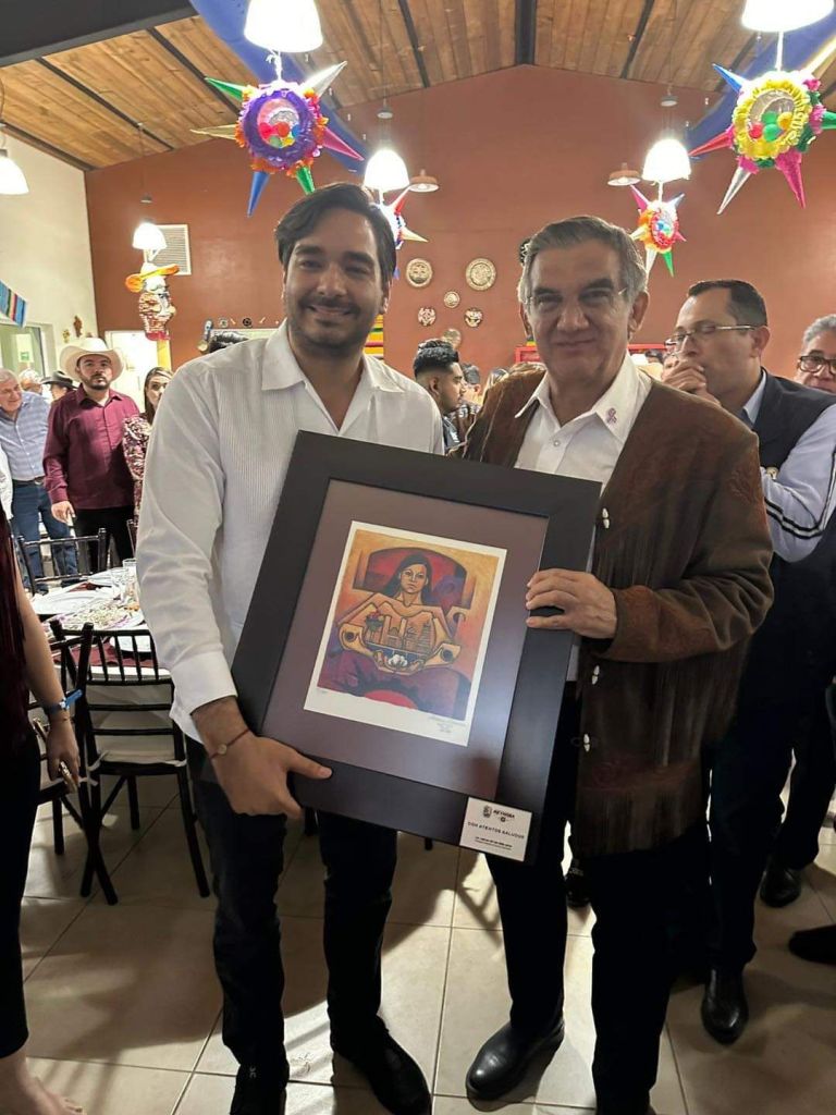 - El Alcalde entregó Al mandatario estatal una obra réplica del mural «Reynosa», firmada por el artista Artemio Guerra.