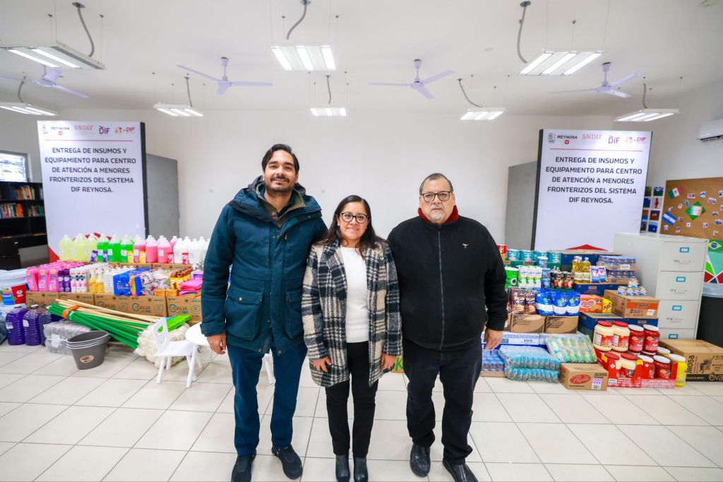 El evento de entrega de suministros se llevó a cabo en el CAMEF del Sistema DIF-Reynosa, con la participación de Gabriela Rosas Blanco, Directora del organismo municipal; Frida Paoletti Leyva, Procuradora de Protección de Niños, Niñas y Adolescentes del DIF local, y Roel Flores Ramírez, Coordinador del Centro de Atención a Menores Fronterizos.