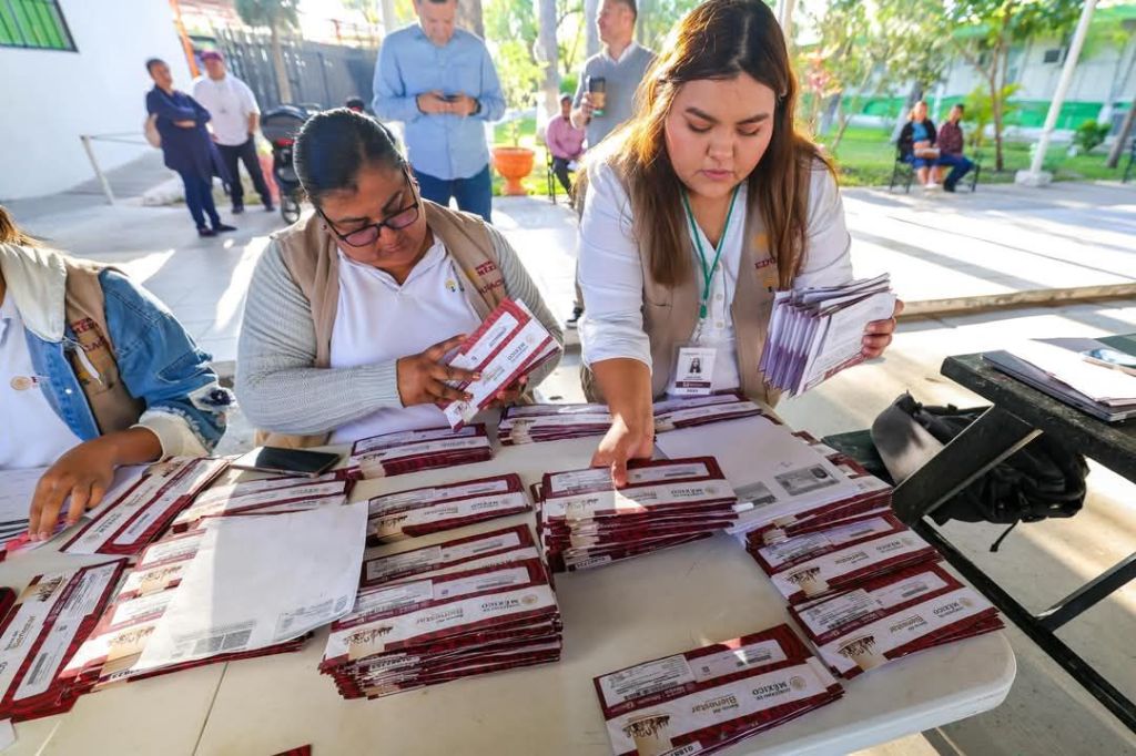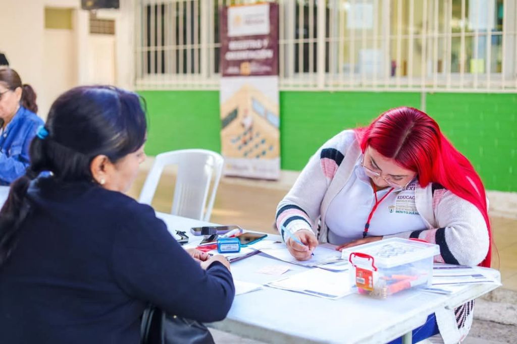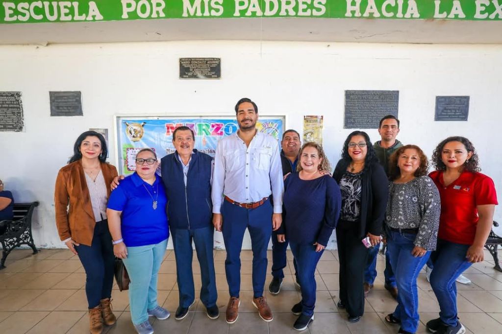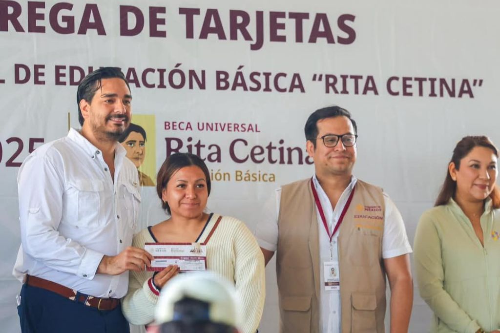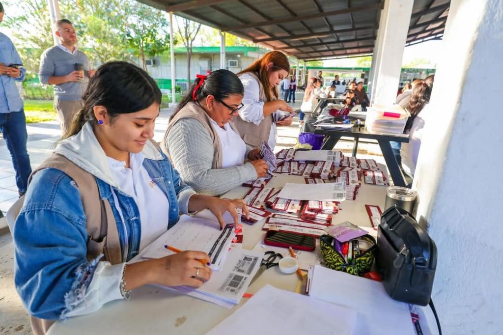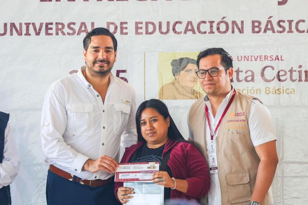 El Presidente Municipal entregó 750 tarjetas de depósito para alumnos de primero a tercer grado, junto a Alexander Alan Bolaños Tinoco, Jefe Regional de la Coordinación de Becas para el Bienestar y el Director de la institución educativa, Profesor José Hernández Tijerina.