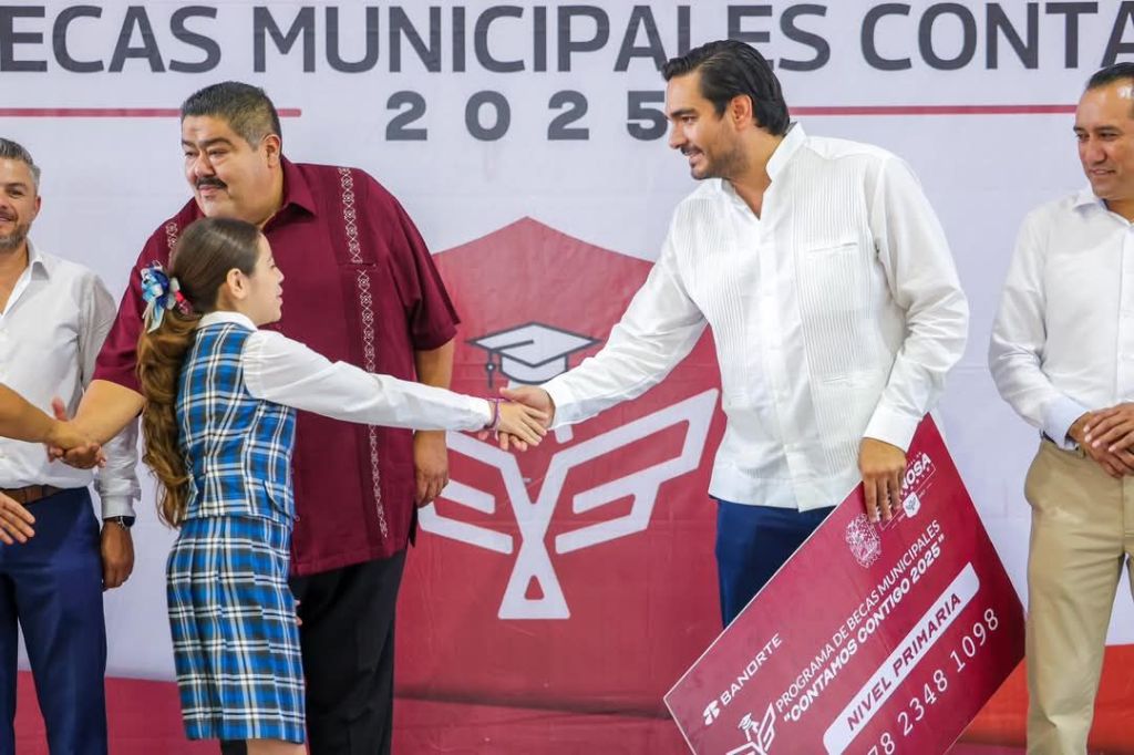 El Presidente Municipal Carlos Peña Ortiz, entregó las Tarjetas de las Becas Municipales «Contamos Contigo» 2025, a los estudiantes de Sexto Año de Primaria, con lo cuál concluyó la primera fase del programa, que ya cubrió el nivel básico, así como a estudiantes de Arte y practicantes de Deporte.