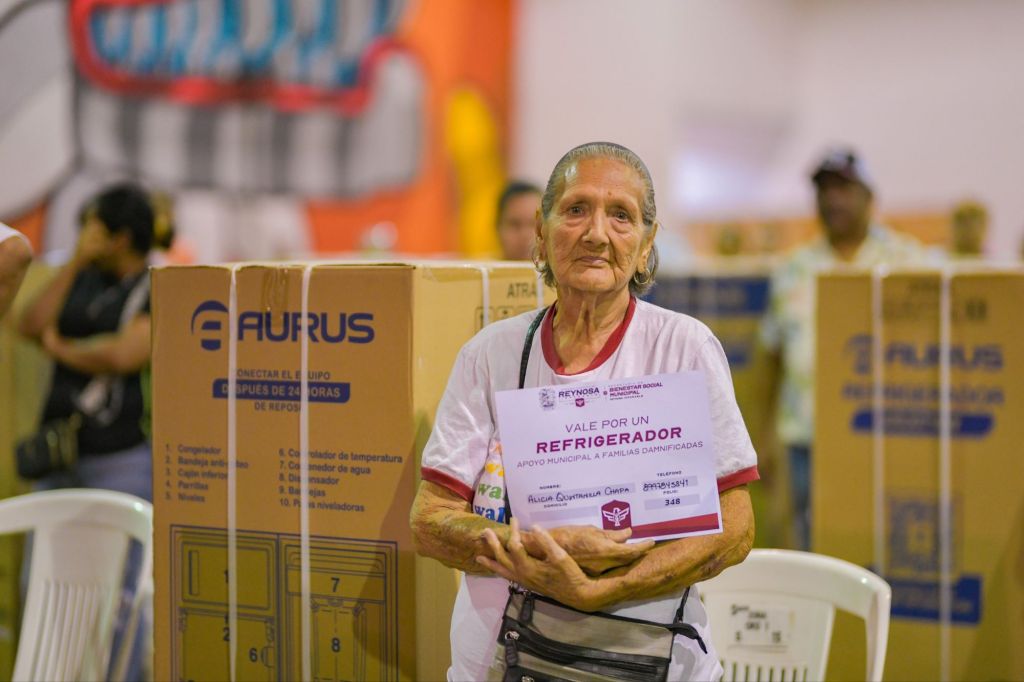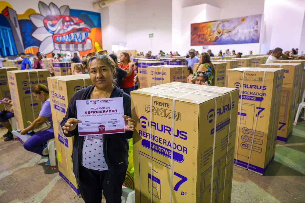 El Presidente Municipal Carlos Peña Ortiz entregó refrigeradores gratuitos a familias reynosenses afectadas por las lluvias, utilizando recursos del fondo municipal para la recuperación y apoyar así a que sigan saliendo adelante y hacer una vida normal tras la tormenta.