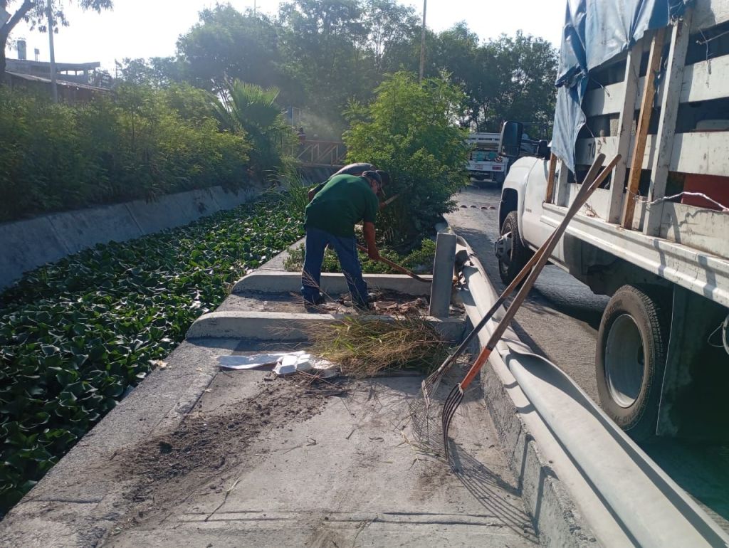 De forma alterna trabajadores retiran la hierba con herramientas manuales, mientras con maquinaria pesada realizan maniobras para retirar el lirio acuático del estanque y evitar proliferación de mosquitos y fauna nociva.