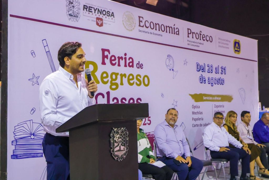 La Feria de Regreso a Clases 2025 organizada por la PROFECO en coordinación con el Gobierno Municipal de Reynosa y la Cámara de Comercio, fue inaugurada por el Alcalde Carlos Peña Ortiz, con la participación de la Senadora de la República, Doctora Maki Esther Ortiz Domínguez y de José Luis Márquez Sanchez, Director de la Oficina de la Defensa del Consumidor.