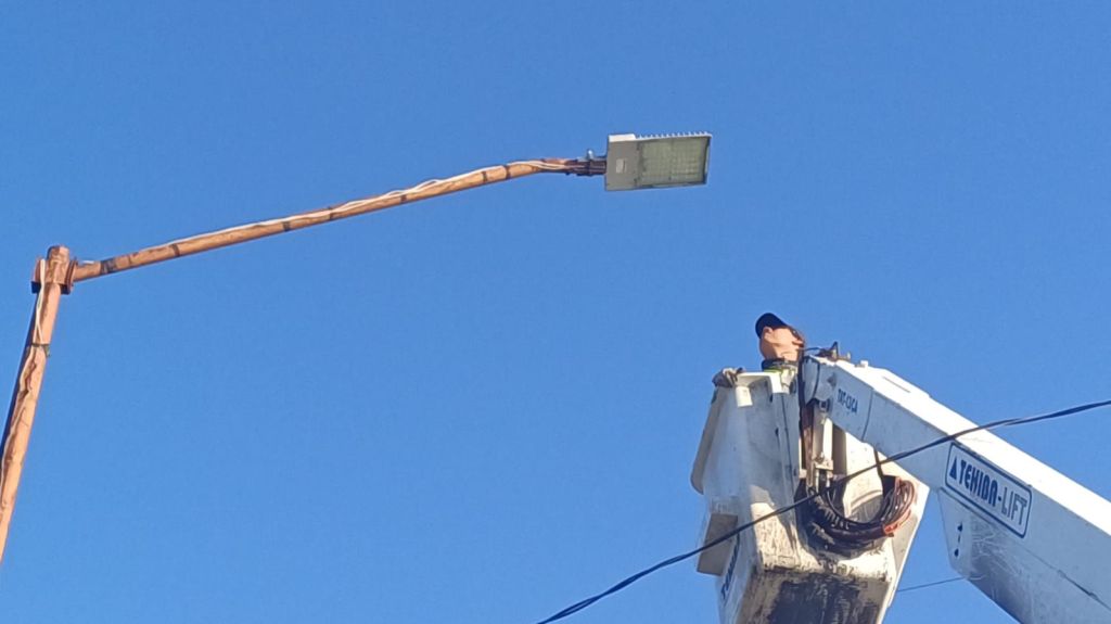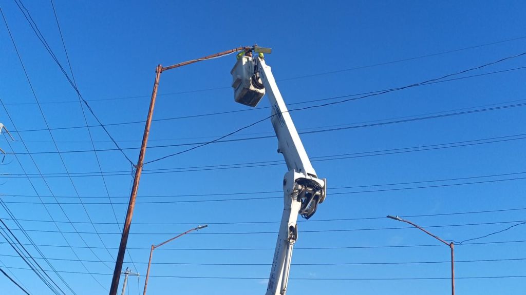 Los trabajadores, con apoyo de canastillas, sustituyeron lámparas Led que no funcionaban y reconectaron otras en buen estado para lograr la iluminación de toda la calle que es paso importante para varias colonias.