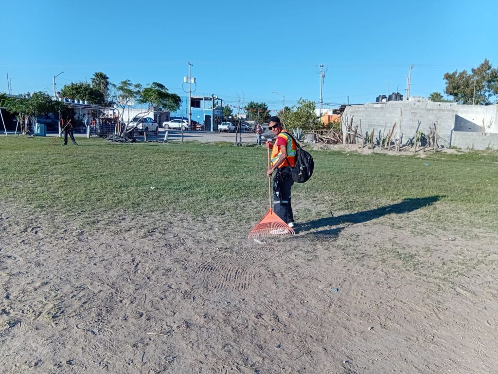 - Limpieza, chapoleo, papeleo, barrido y raspado en Plaza de la colonia Valle Soleado, calle Paseo del Sol con calle Paseo del Desierto.